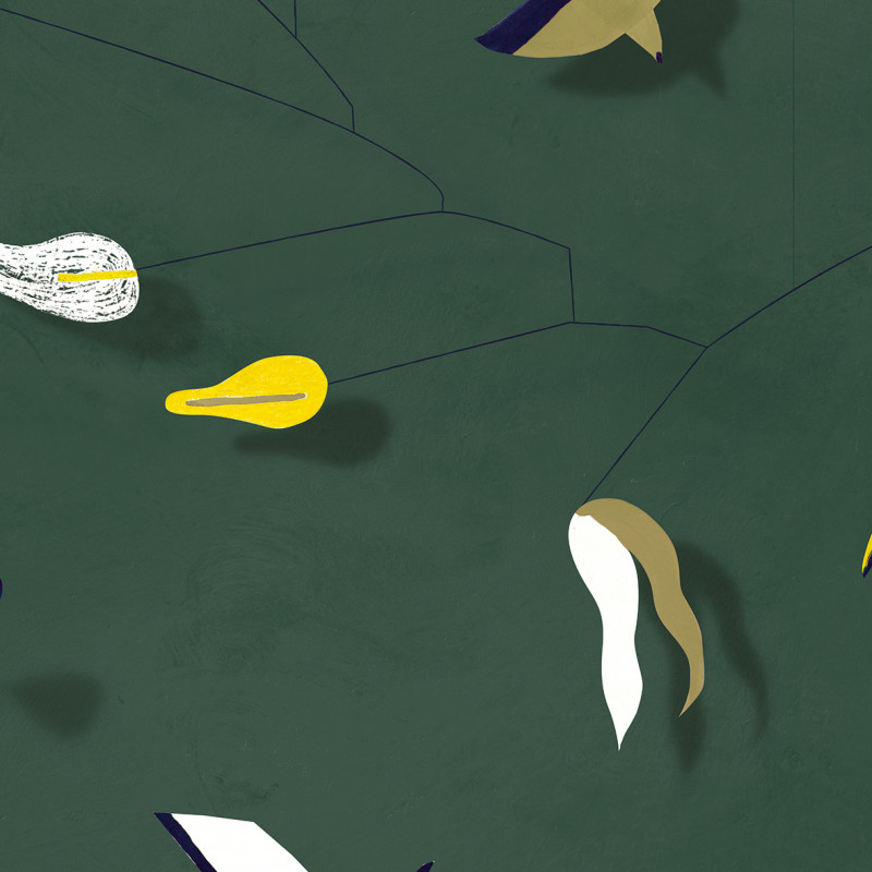 De panoramische Les Mobiles is geïnspireerd op de beroemde Calder-mobielen om een sfeer van ophanging en delicatesse te creëren. Les Mobiles zijn er in drie kleuren: een lichte kleur op een gemarmerde ondergrond en twee intense kleuren, saffraan en cipres. Eén rol bevat vier druppels van 27 1/2 inch x 130 inch, of een volledig panoramisch van 110 1/4 inch x 130 inch.