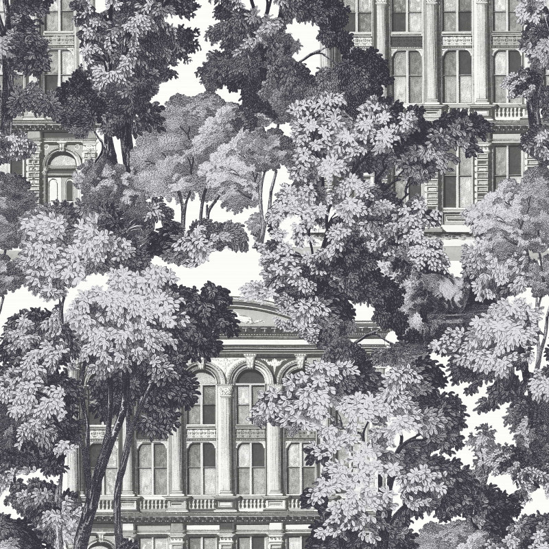 Palazzo behang heeft het matte vlies bloemmotief is ontworpen in de stijl van een historische gravure. Een Romeins kasteel doemt op uit het dichte gebladerte. Het werd opnieuw geïnterpreteerd met heldere, moderne kleuren.