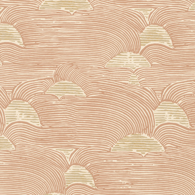 Het reliëf van het zonsopgangbehang benadrukt het dromerige abstracte landschap subtiel. Deze tekening uit de vrije hand van een golf, een wolk en een zonsondergang is verkrijgbaar in pasteltinten en gedempte tinten, met metallic glans die materie en reliëf toevoegt.