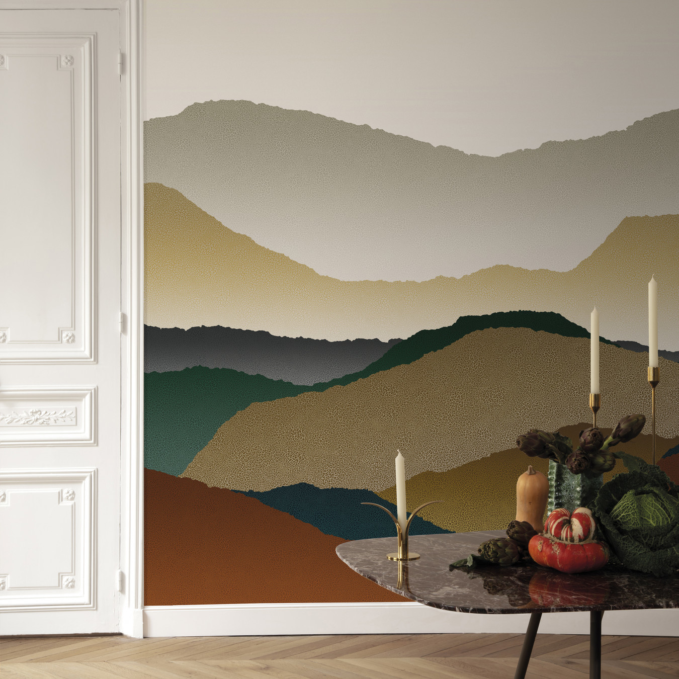 Ukiyo, "drijvende wereld" in het Japans, is geïnspireerd op traditionele prints om een bergketen, een zee van wolken of gekleurde golven op te roepen. Gedrukt op een iriserende mica-achtergrond, imiteert de panoramische textuur het craquelé-effect van raku, een kostbaar Japans keramiek met een "verschroeide aarde" -effect. Een rol is opgebouwd uit 4 stroken van 70 cm x 330 cm, dus een compleet panorama van 280 cm x 330 cm.