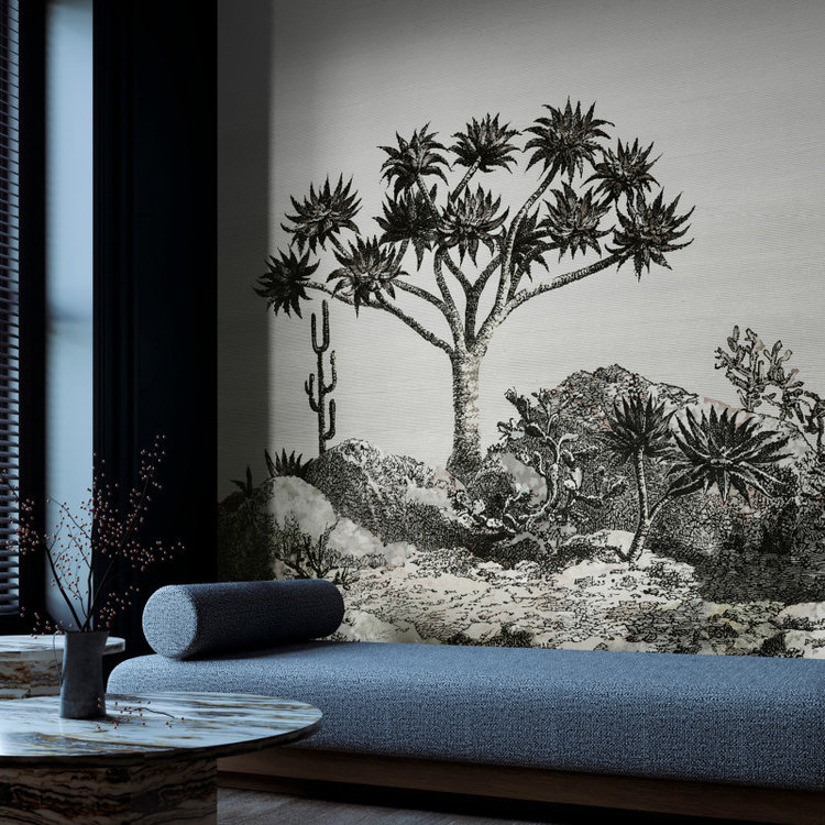 Yucca is een behang met een grote ingekleurde gravure geïnspireerd op de beroemde woestijnplant met dezelfde naam. Deze muurbekleding van Nobilis voelt als een combinatie tussen een gravure en een striptekening. De combinatie van de getekende zwarte lijnen en de felle kleuren maken het behang springlevend. Perfect voor een uitdagend, etnisch en natuurlijk interieur.