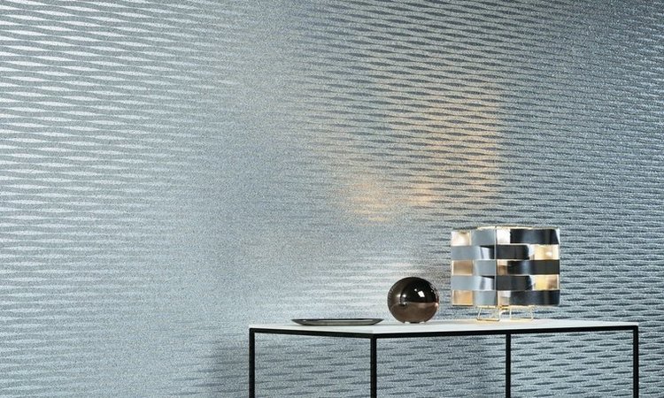 Voeg glamour toe aan uw interieur met het mica behang Omexco Graphite. Dit behangpapier heeft een ondergrond van metallic folie die bekleed is met een strepen van mica, die van en naar elkaar toe lopen.