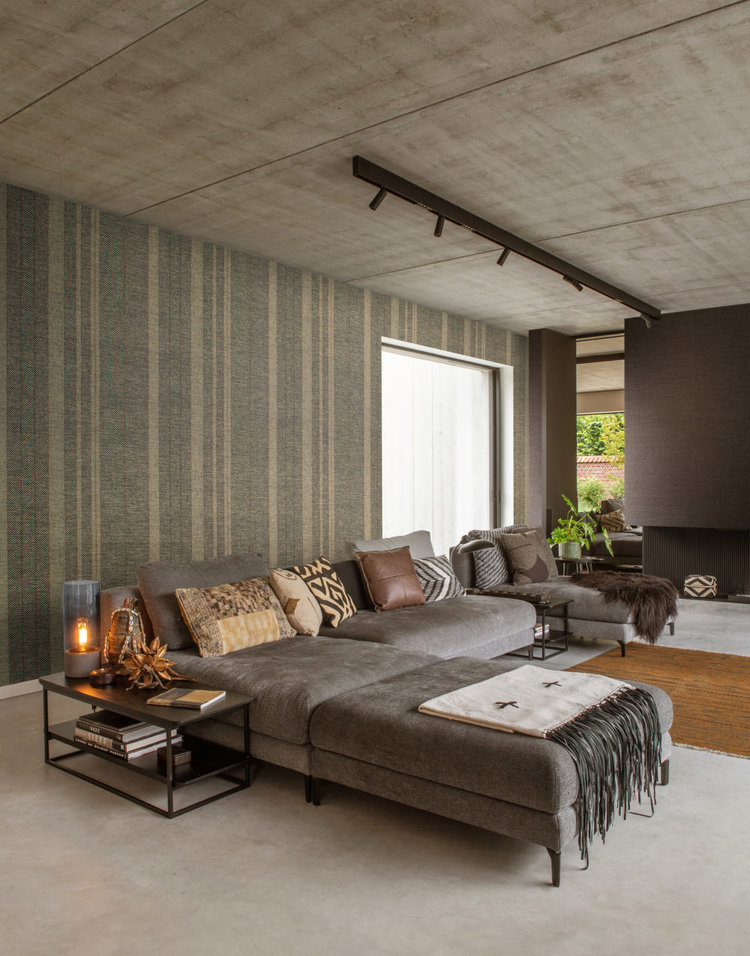 De asymmetrische streep op Rhythm behang is prachtig. Omexco onthult de kunst van voorouderlijke weeftradities met papier dat een eerbetoon is aan traditionele weeftradities van Azië tot Afrika.