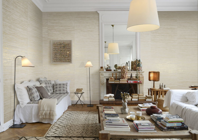 Geweven raffiavezels behang is gemaakt van raffiavezels die op een gouden, zilveren of koperen achterkant zijn geweven om licht te reflecteren. De ambachtsman bedekt de vezels na het weven in metaaltinten. Seraya, een luxeboek, is een ode aan de aarde en al haar pracht.