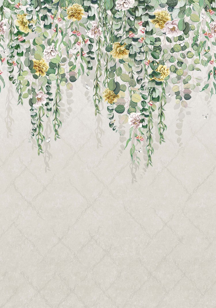 Bloeiende eucalyptus verweeft zich met pioenroosbloesems en kleine witte vlinders. Het gebladerte valt neer op een muur met textuur, de bladeren vormen een schaduw op een delicate ombrÙ van kleur en een subtiel trellis dat in en uit elkaar valt.
