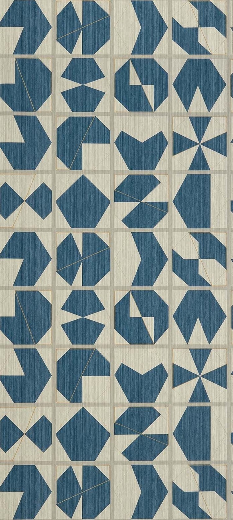 Kutani Vinyl behang. Een ontwerp van zeshoeken, vierkanten en driehoeken die door elkaar worden gesneden en bedekt met metalen lijnen. Bedrukt en reliëf met een verticale strié.