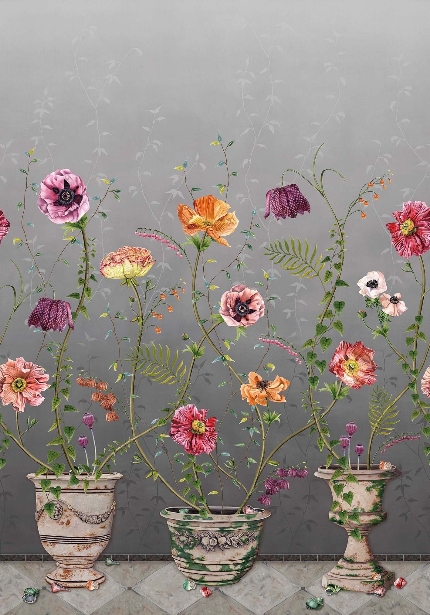 Overdreven bloemen van fritillaria, klaprozen en anemonen, en kruipende wijnranken groeien uit terracotta urnen, tegen een in kalk gehulde muur, met een betegelde stenen vloer bezaaid met kleurrijke schelpen.