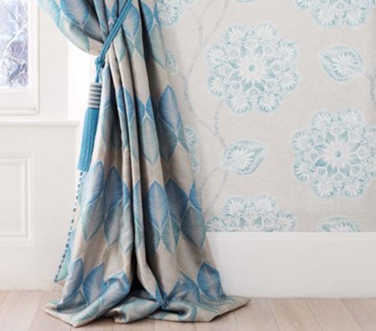 Behang uit de collectie Verdanta van Osborne & Little. Patroon Mumtaz (W6593-02) met bloem in kleur grijs en groengeel en zilver.