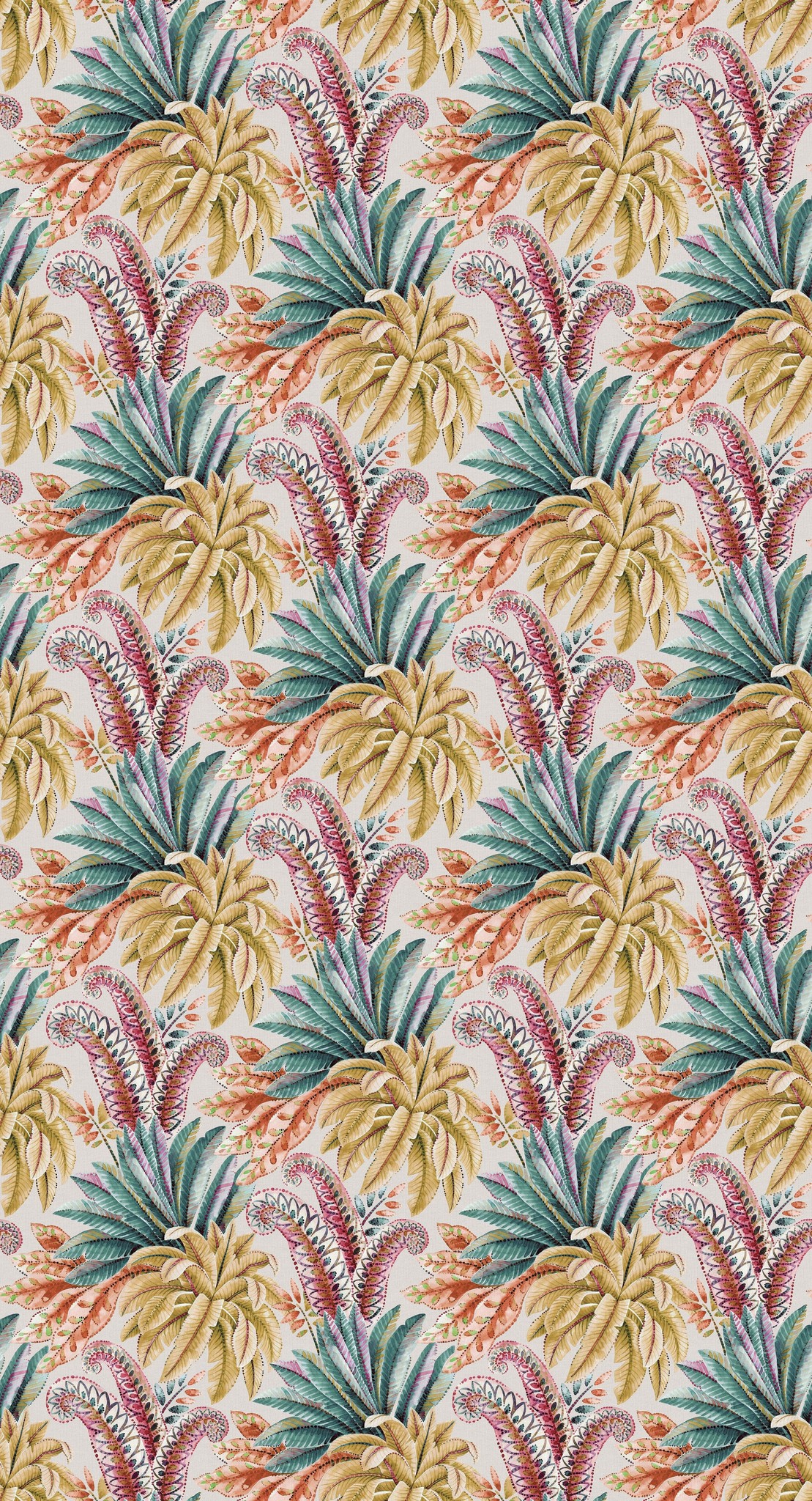 Een flamboyant ontwerp met varens en gestileerde paisleybladeren is gedrukt op een linnen ondergrond met reliëf. Genoemd naar een tuin in Nieuw-Zeeland.