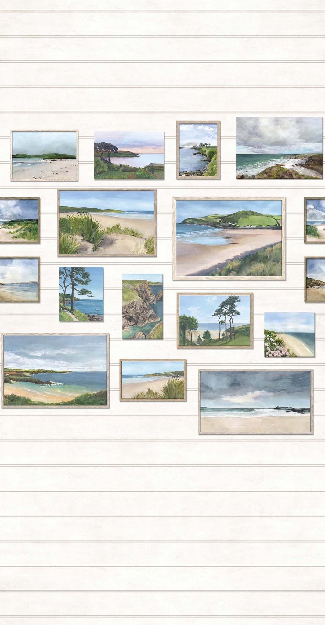 Schilderijen met aquarel zeegezichten worden tentoongesteld op een met beschilderd hout beklede muur.