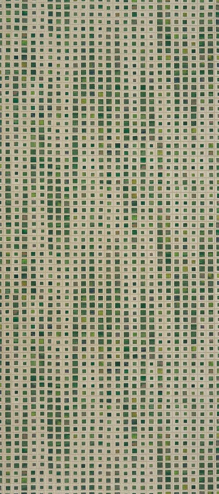 Sunago Vinyl behang. Een lineair metalen raster herbergt schilderachtig gekleurde vierkanten in verschillende maten die een golvend patroon over het ontwerp creëren. Bedrukt en reliëf met een verticale strié.