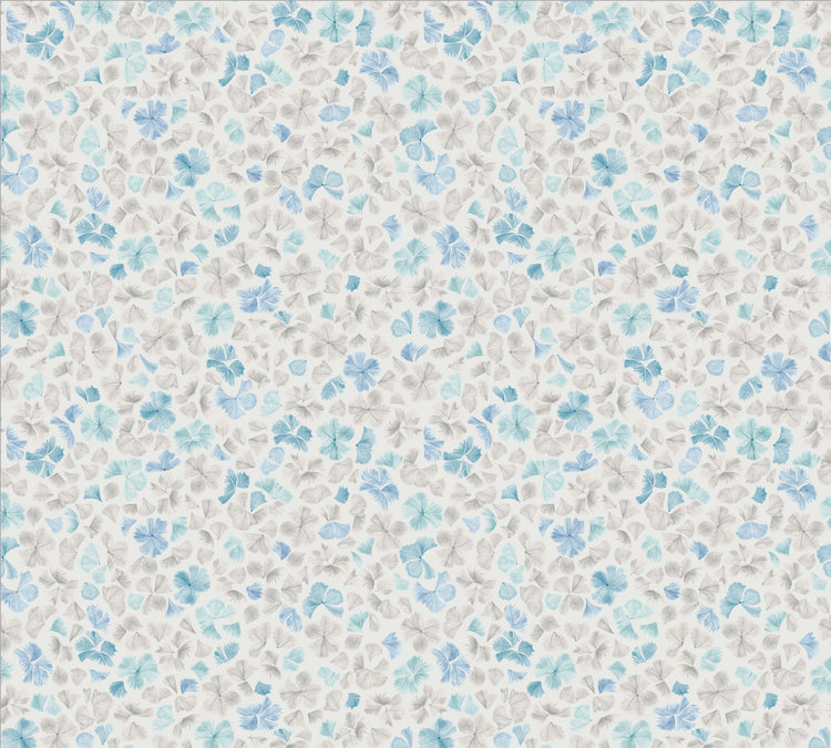 Een delicaat bloemenmotief, met abstracte bloemen die zachtjes in de wind zweven. Het ontwerp is gemaakt met waterverf en krijt en is geïnspireerd op de veerachtige contouren van palmbladeren. V