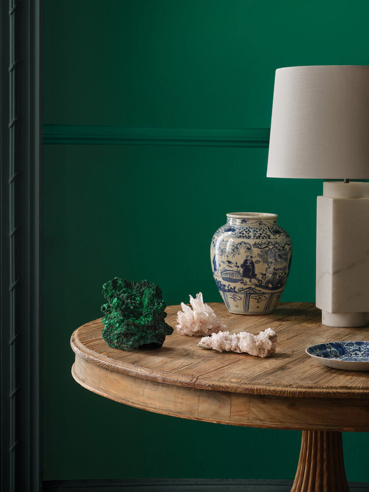 Deze weelderige tint is geïnspireerd op een uitzonderlijk stuk fluwelen malachiet, ook wel ‘zijdeachtige malachiet’ of zelfs ‘verboden broccoli’ genoemd. Deze bijzondere stenen ontstaan in grotten, waar ze sculpturale en soms stalagmitische vormen aannemen. Hoewel ze zwaar en koel aanvoelen, zijn ze geliefd om hun karakteristieke groen-koperen patina wanneer ze gepolijst worden.