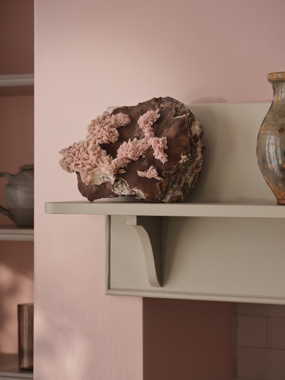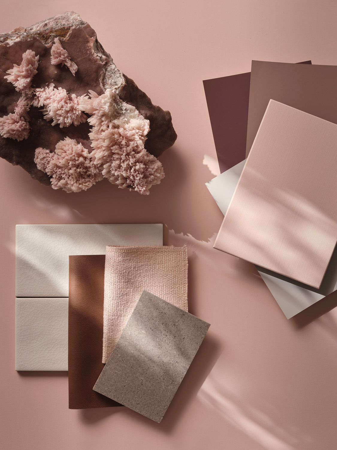 Deze verfijnde roze tint is geïnspireerd op een unieke, koraalachtige calcietcluster die zich heeft gevormd op een basis van bariet. De zachte grijstinten van de bariet creëren een prachtig contrast met het delicate, bloemachtige karakter van het roze, zowel in kleur als in vorm.