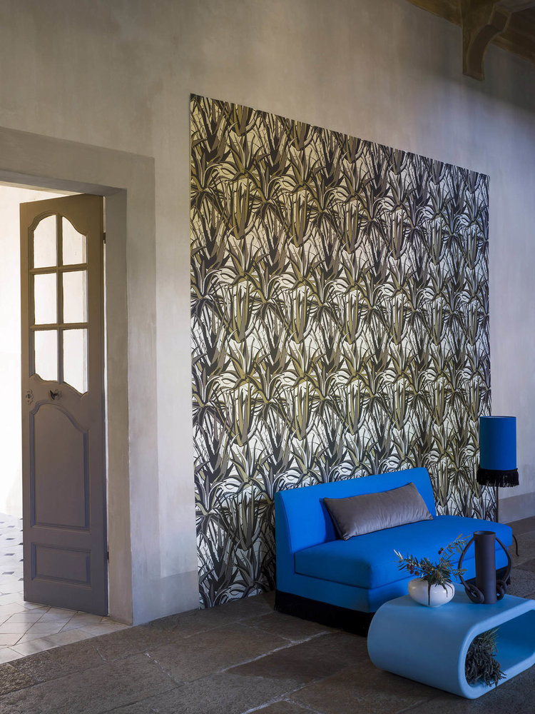 Een grafische en eigentijdse versie van een mediterrane tuin waar agaves en vetplanten verstrengeld zijn. De traditionele druk mat en glad brengt zachtheid en elegantie in de kleuren.