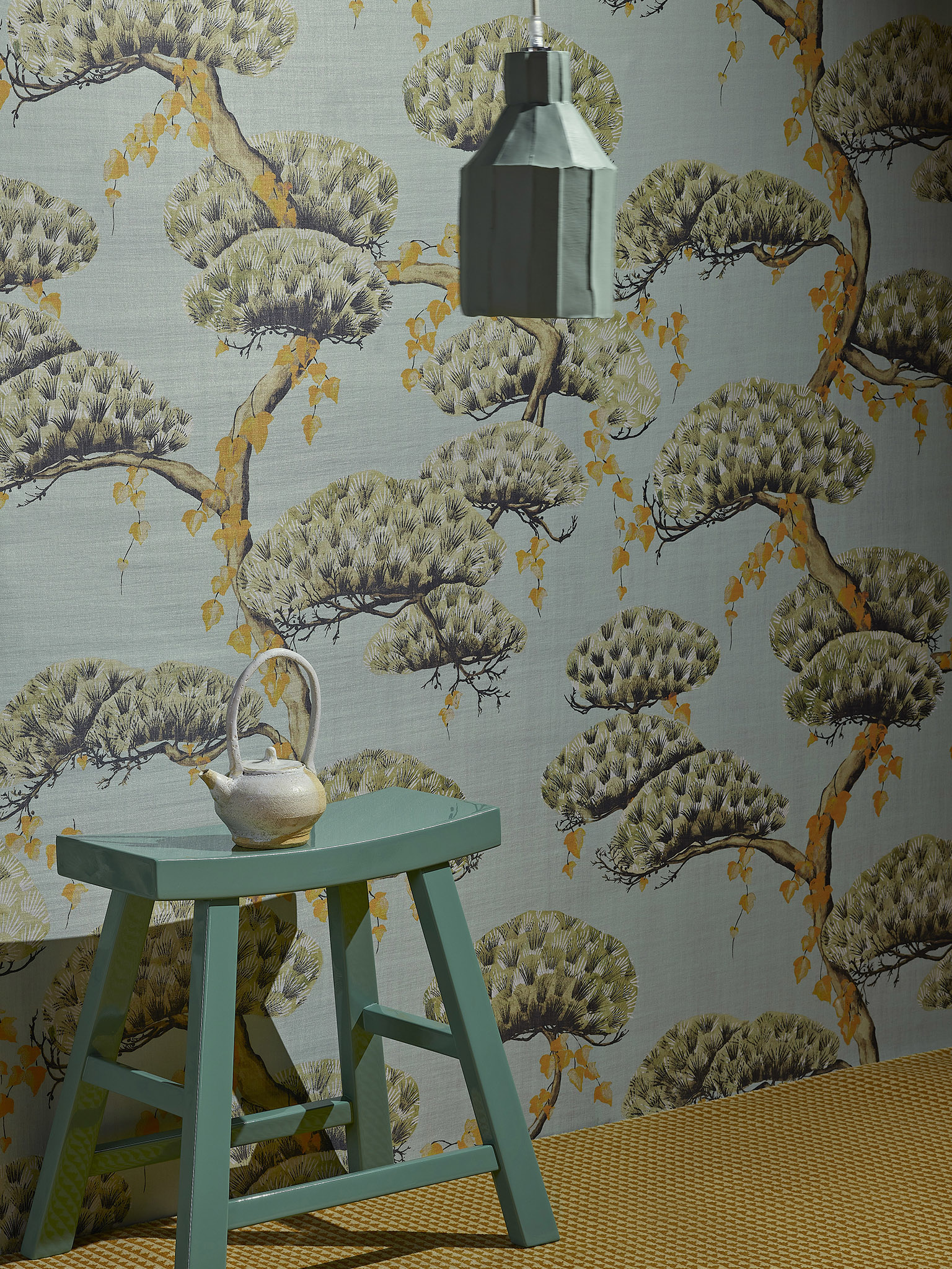 Momiji-behang is een waar feest van de magie van de natuur; Momijigari is een Japanse traditie waarbij men de blozende bladeren van esdoorns aanschouwt. Het behang, dat wordt gesublimeerd door een digitale overdruk op een metalen achtergrond en gelamineerd op non-woven, verandert en verdiept afhankelijk van het licht.