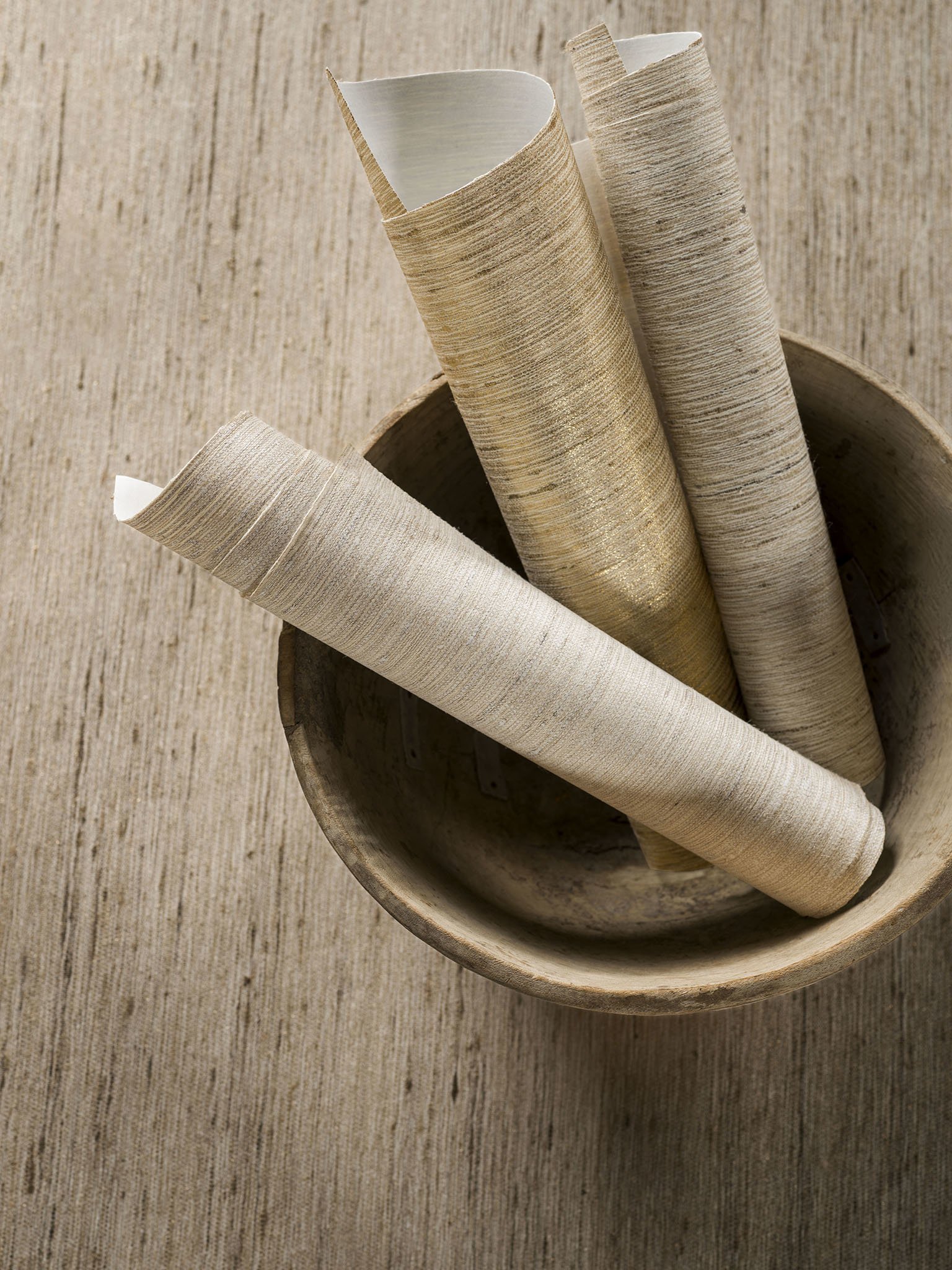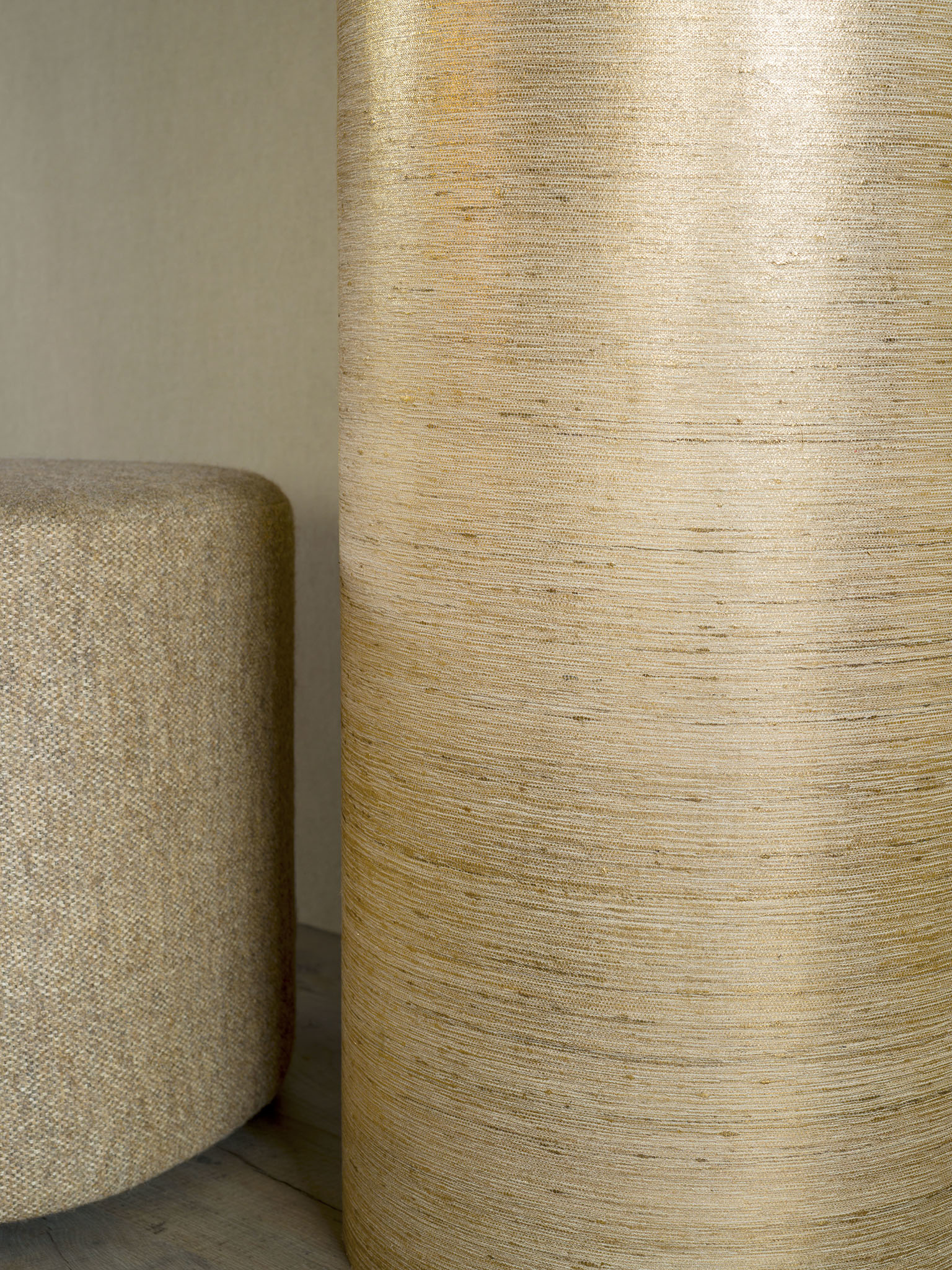 Prachtige handgemaakte zijde gelamineerd op grote breedte non-woven. Deze in goud of wit overdrukte wandbekleding verlevendigt de muur met opvallende lichtspelingen.
