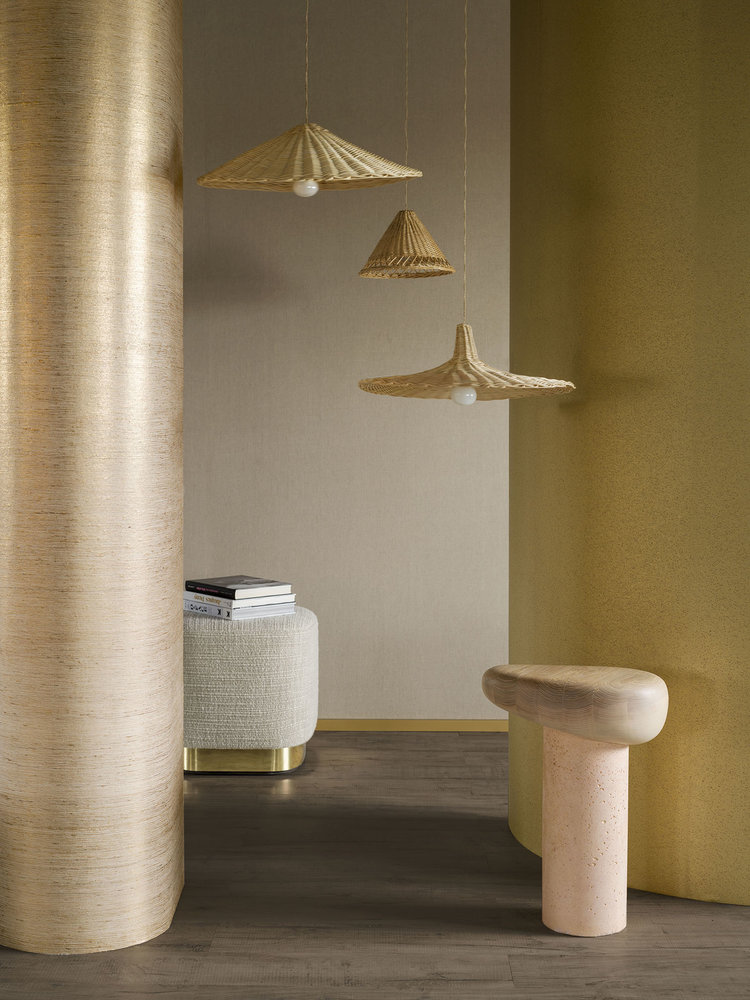 Prachtige handgemaakte zijde gelamineerd op grote breedte non-woven. Deze in goud of wit overdrukte wandbekleding verlevendigt de muur met opvallende lichtspelingen.
