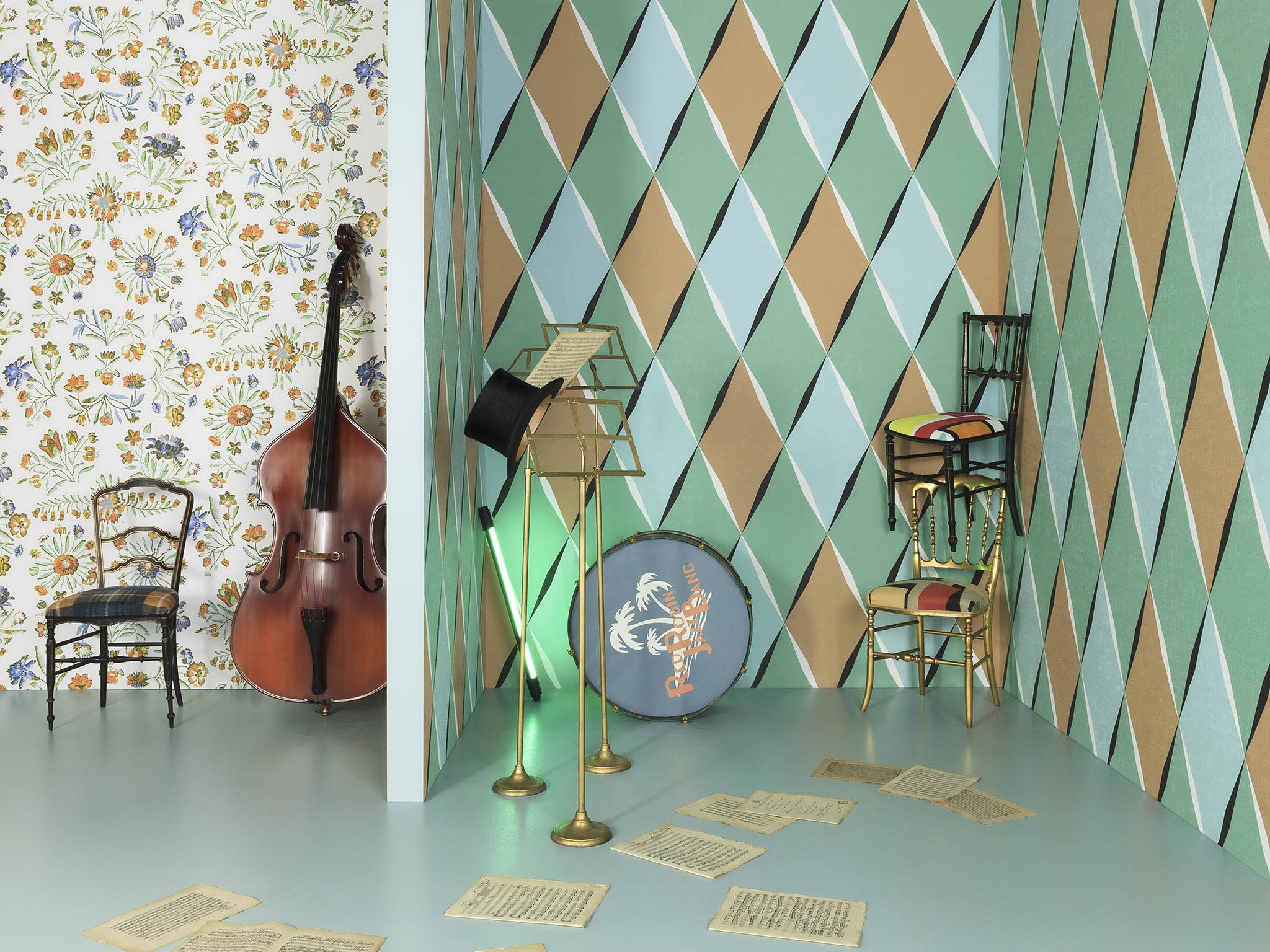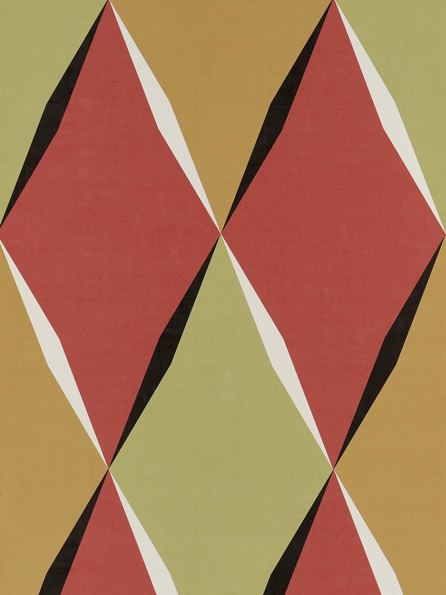 Groot geometrisch patroon bestaande uit ruiten waarvan de schaal en combinatie van kleuren volume en diepte aan de muur geven. Gedrukt op een reliëf vinyl met een ongestructureerde linnen look en een matte afwerking.
