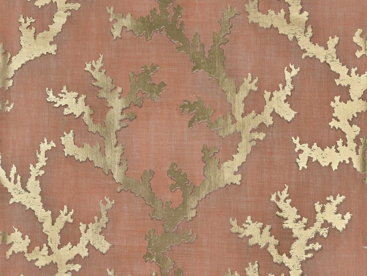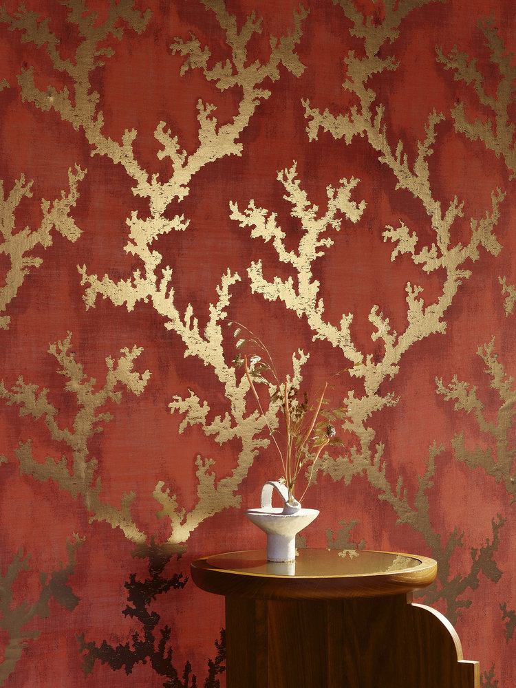 Corail Magique behang neemt je mee naar de mooiste zeebodems, waar koralen met metallic en parelwitte reflecties op de muren dansen. Het behang, dat wordt gekanaliseerd door een digitale overdruk op een metalen achtergrond en gelamineerd op non-woven, verandert en verdiept afhankelijk van het licht.