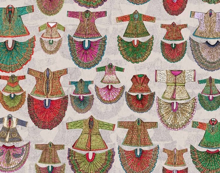 Deze print reproduceert een geverfd paneel uit het einde van de 19e eeuw dat Patrick Frey ontdekte toen hij in Dallas, Amerika hing in het kantoor van Mr. Kelly Hardage. Het ontwerp bestaat uit een veelheid aan traditionele, dagelijkse of rituele Perzische taferelen. Niet getrimd.