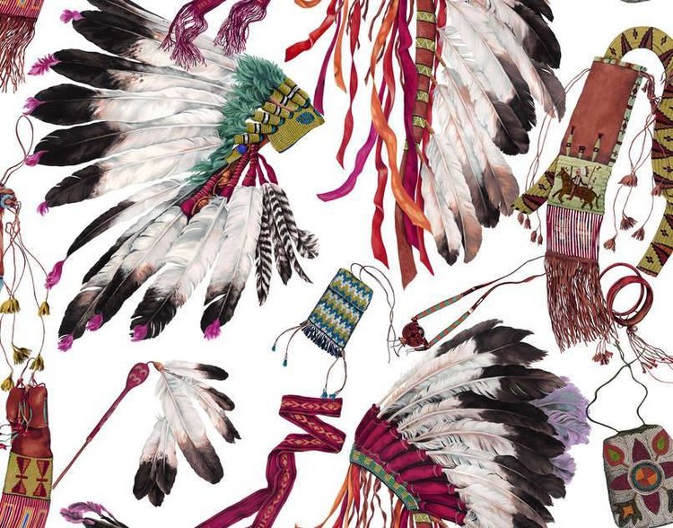 Dit met de hand geschilderde ontwerp is een waar eerbetoon aan de weelderige en majestueuze hoofdtooien van Indiaanse stamhoofden. Elk veren- of sieraadornament heeft een speciale betekenis: creatieve kracht, moed, eer of trots. Met dit ontwerp drukt Pierre Frey zijn enthousiasme uit voor de ambachtelijke knowhow van deze stammen. Gedrukt op extra breed non-woven papier, dit motief is ook verkrijgbaar als een stof (F3253).