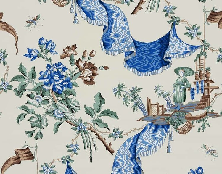 Dit behang reproduceert een motief dat bekend staat als "The Drapery" en is rond 1795 gedrukt op katoen met de koperplaattechniek door de fabrikant Navens, Favre, Petitpierre en Cie. Het combineert een Chinese figuur met een parasol en een boeket verfraaid met een gordijn in een theatrale stijl. Perfecte illustratie van Franse chinoiserie-kunst waar de iconografische Europese en Chinese elementen worden gemengd. Zeefdruk met de hand.