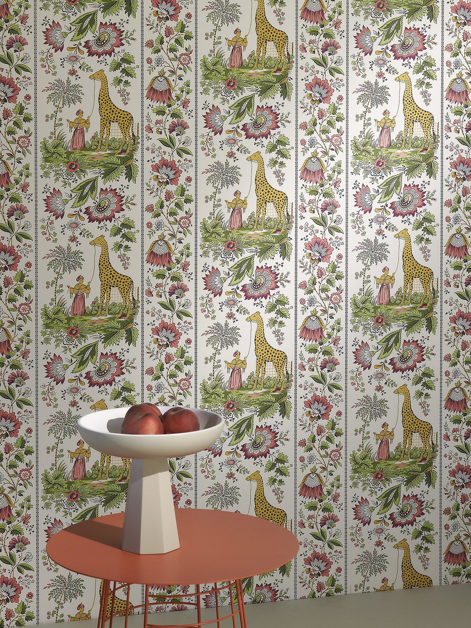 Ismaelia is een behang dat geïnspireerd is op de 19e eeuwse paneelschilderingen. Deze muurbekleding van Pierre Frey uit de Les Dessins 6 collectie toont stroken met Afrikaanse planten, bloemen en giraffes. Een exotisch behang dat perfect is voor een klassiek, sprekend en tijdloos interieur.