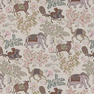 Deze prent reproduceert de exotische charme van een archief uit het einde van de 19e eeuw. Op een terrein van gebloeide longblaasjes roepen dieren (olifanten, dromedarissen, leeuwen, pauwen) en bomen de weelde van de Perzische natuur op.