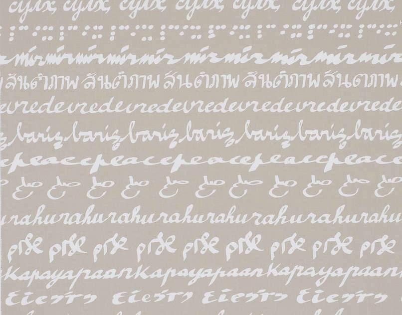 Het woord 'vrede' vertaald in verschillende talen op natuurlijke media zorgt voor totale gemoedsrust met betrekking tot het ontwerp van Clara Halter.