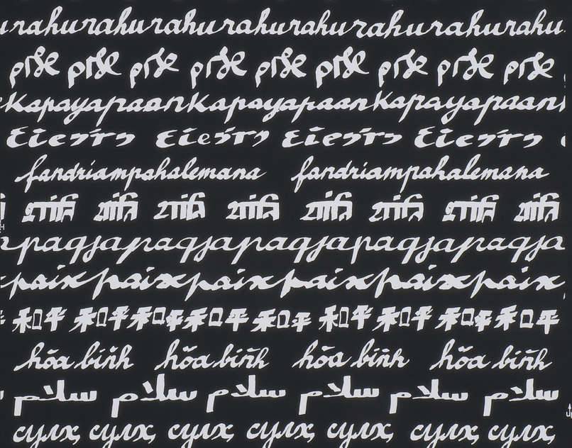 Het woord 'vrede' vertaald in verschillende talen op natuurlijke media zorgt voor totale gemoedsrust met betrekking tot het ontwerp van Clara Halter.