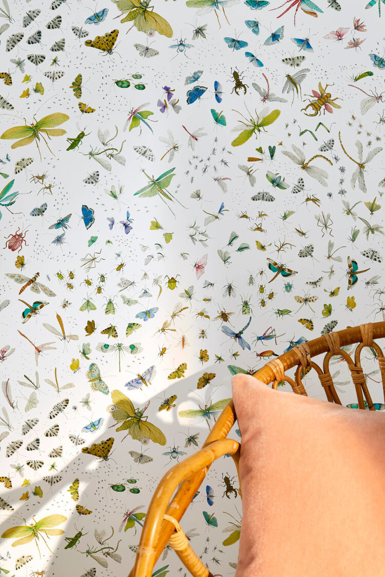 La serre aux papillons behang toont een vlucht van licht, levensechte vlinders en insecten in ingewikkelde kleuren.