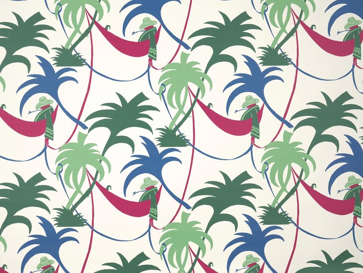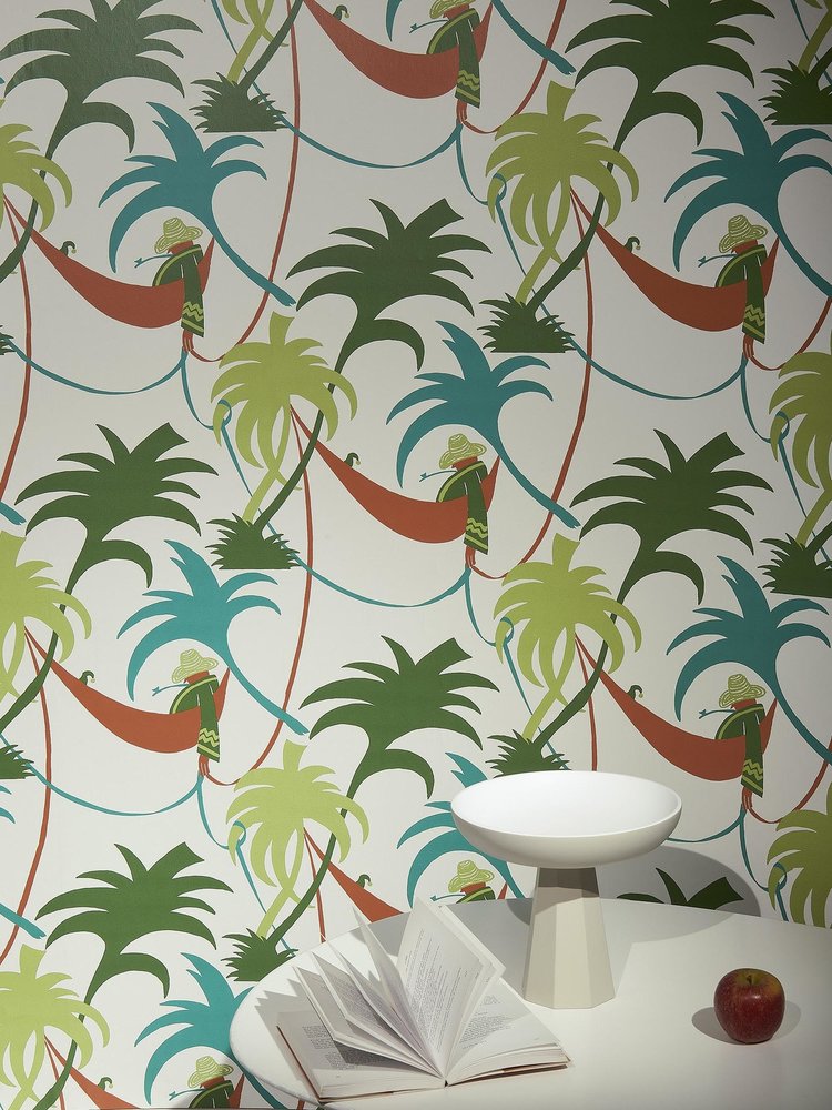 La Siësta is een behang dat geïnspireerd is op de middagdutjes in de Mediterranee. Deze muurbekleding van Pierre Frey uit de Les Dessins 6 collectie heeft een patroon vol palmbomen, hangmatten en slapende figuren. Een grafisch behang dat perfect is voor een vrolijk, kleurrijk en sprekend interieur.