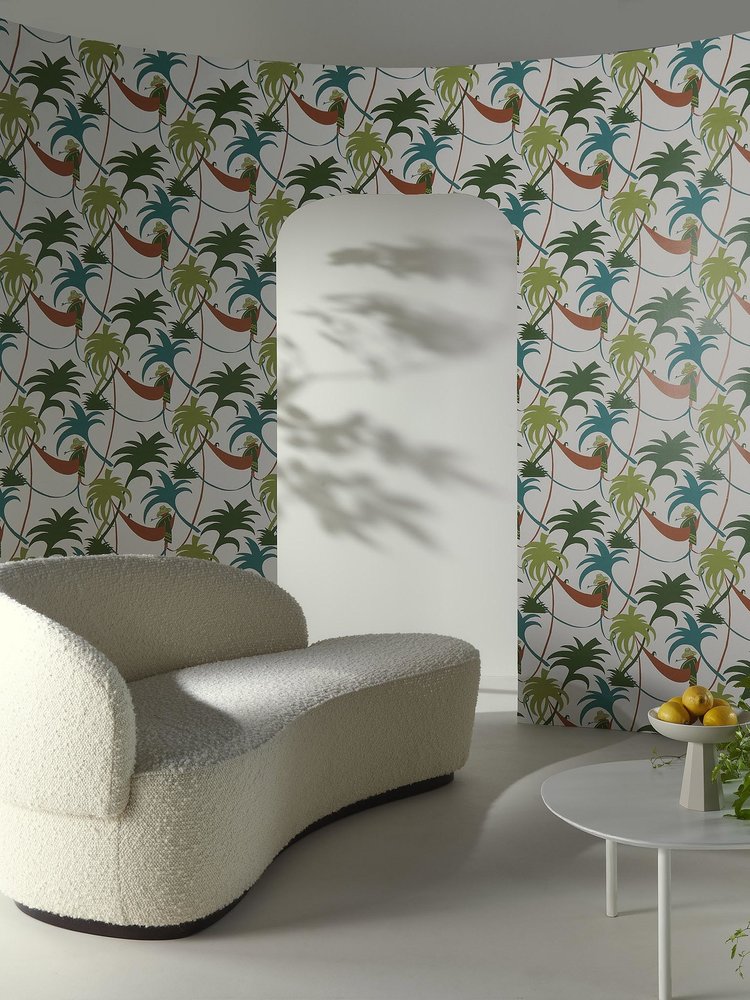 La Siësta is een behang dat geïnspireerd is op de middagdutjes in de Mediterranee. Deze muurbekleding van Pierre Frey uit de Les Dessins 6 collectie heeft een patroon vol palmbomen, hangmatten en slapende figuren. Een grafisch behang dat perfect is voor een vrolijk, kleurrijk en sprekend interieur.