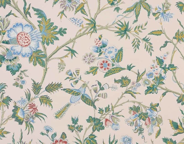 Dit behang met een patroon van bochtige bloemstengels in een Indiase stijl, roept een gekleurde achtergrond op die de Indiase mode uit de 18e eeuw oproept. Zeefdruk met de hand.