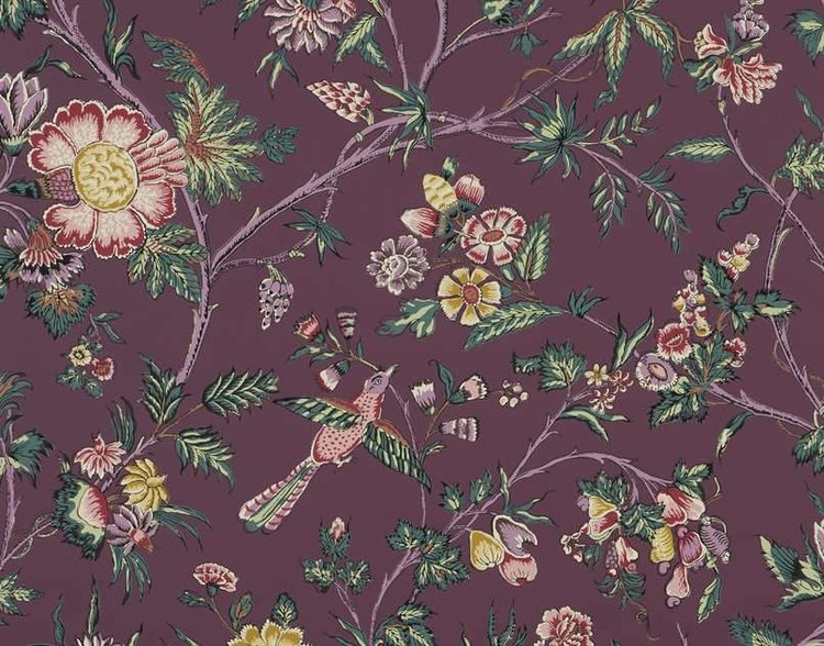 Dit behang met een patroon van bochtige bloemstengels in een Indiase stijl, roept een gekleurde achtergrond op die de Indiase mode uit de 18e eeuw oproept. Zeefdruk met de hand.