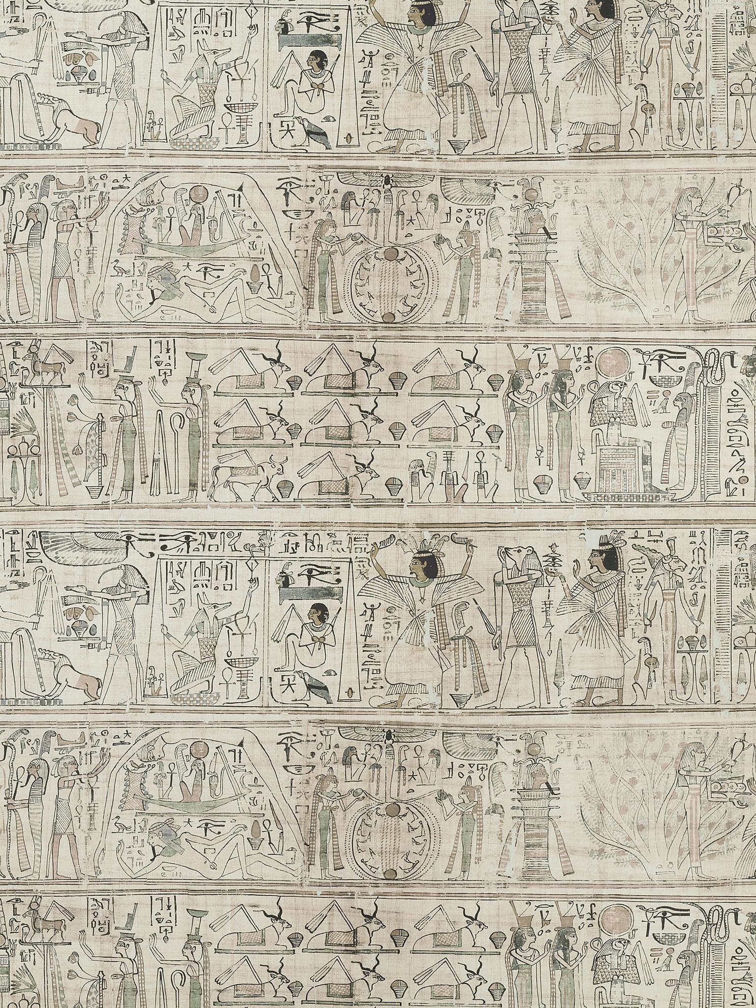 Deze getrouwe compositie van de mythologische papyri van Nespakachouty, gedrukt op mat niet-geweven stof, dateert uit de eenentwintigste dynastie en is bewaard in het departement Egyptische Oudheden van het Louvre. Het vertegenwoordigt de schrijver-accountant van de granen van het domein van Amon, evenals verschillende goden zoals Osiris, Hepethor of de god van de aarde Geb onder het hemelgewelf Nout. In brede breedte bedrukt.