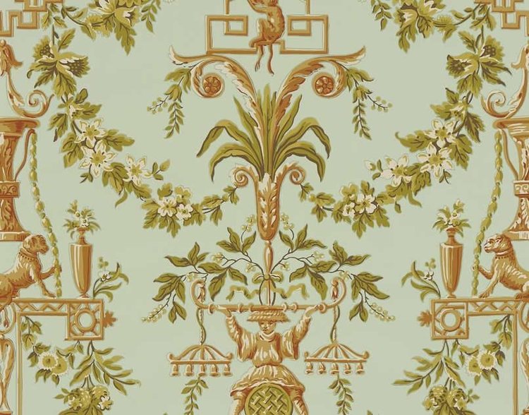 LES LIONS reproduceert een passend behang gedrukt met de blokdruktechniek door de fabrikant Royale Réveillon in Parijs rond 1786. We bewaren het originele behang in ons archief. Dit motief is ook beschikbaar op gedrukte percale onder de referentie L3636 Zeefdruk met de hand.