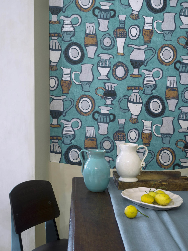 Dit patroon is gebaseerd op een gouache uit 1950 gevonden in de archieven van Pierre Frey. De presentatie van een verzameling potten van geëmailleerde klei herinnert aan het enthousiasme voor aardewerk in die tijd. De kleuren spelen met okergele klei op een parelachtige achtergrond die doet denken aan keramiek en hun vernissen.