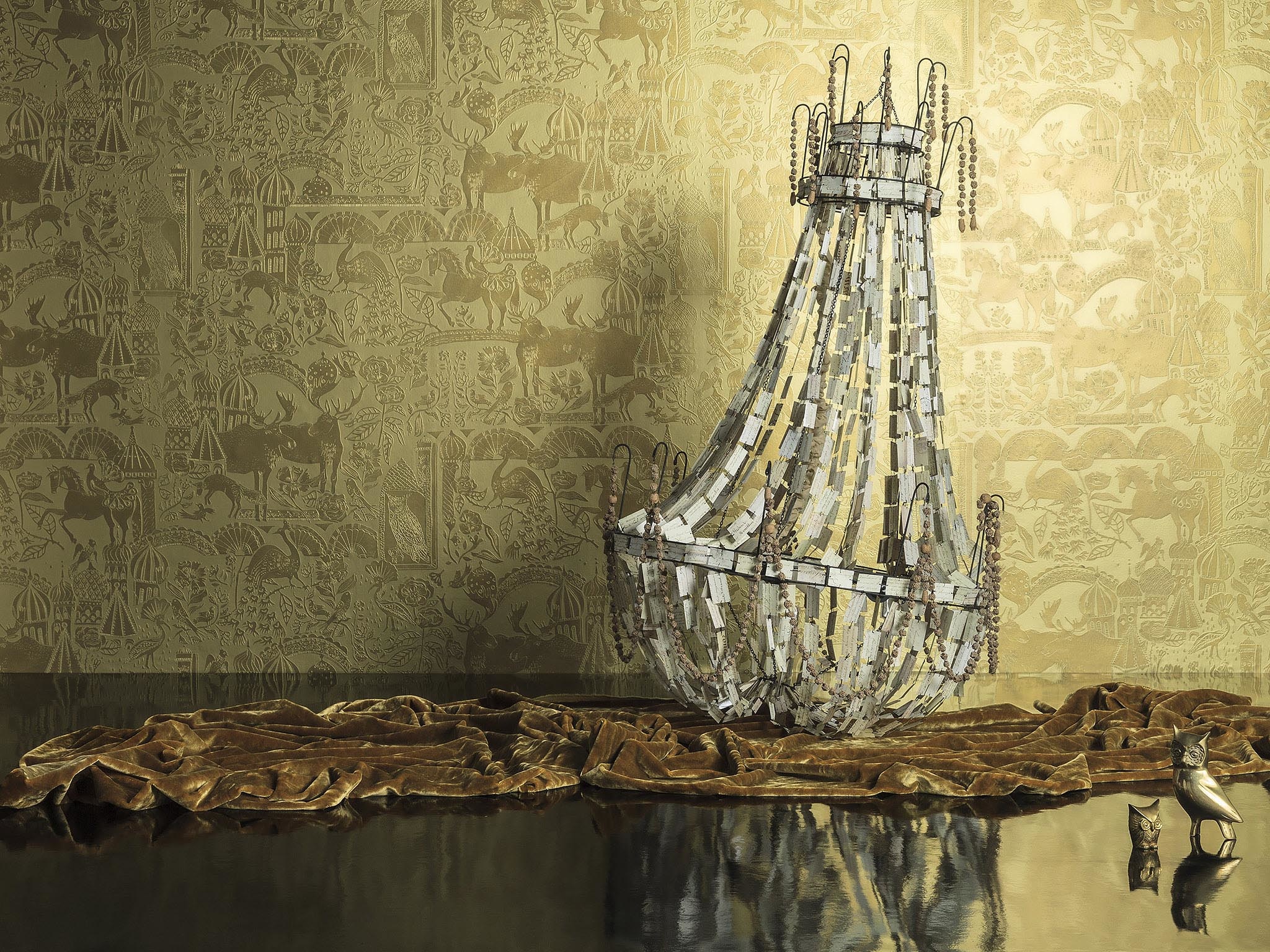 Reis naar het hart van het Lossiny-bos in Rusland, ook wel bekend als het Elk-eiland. Het 3D-printen op een metalen achtergrond reproduceert de karakteristieke details van traditionele linosneden die door de kunstenaar zijn gebruikt om dit eigentijdse ontwerp te creëren. Dit behang bestaat ook in een gekleurde versie onder de referentie LOSSINY FP874.