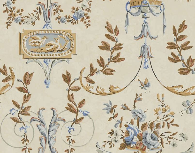 Deze vrouw speelde een belangrijke rol tijdens de revolutie en redde veel mensen van de guillotine. Dit ontwerp reproduceert een soort behang dat kenmerkend is voor de neoklassieke trend aan het einde van de 18e eeuw, en wordt bewaard in onze archieven. Het bestaat uit arabesk rinceaux, bloemcomponenten in boeketten of slingers, evenals een ei-en-dartcartouche die een paar duiven voorstelt. Zeefdruk met de hand.