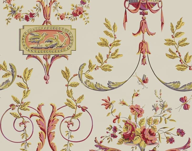 Deze vrouw speelde een belangrijke rol tijdens de revolutie en redde veel mensen van de guillotine. Dit ontwerp reproduceert een soort behang dat kenmerkend is voor de neoklassieke trend aan het einde van de 18e eeuw, en wordt bewaard in onze archieven. Het bestaat uit arabesk rinceaux, bloemcomponenten in boeketten of slingers, evenals een ei-en-dartcartouche die een paar duiven voorstelt. Zeefdruk met de hand.