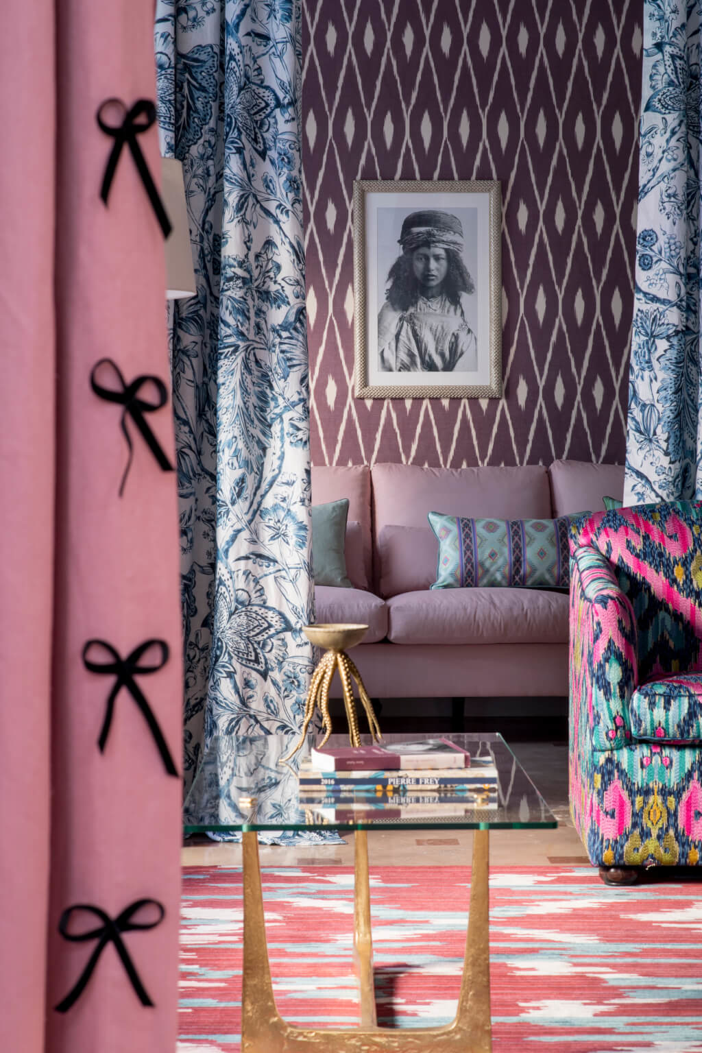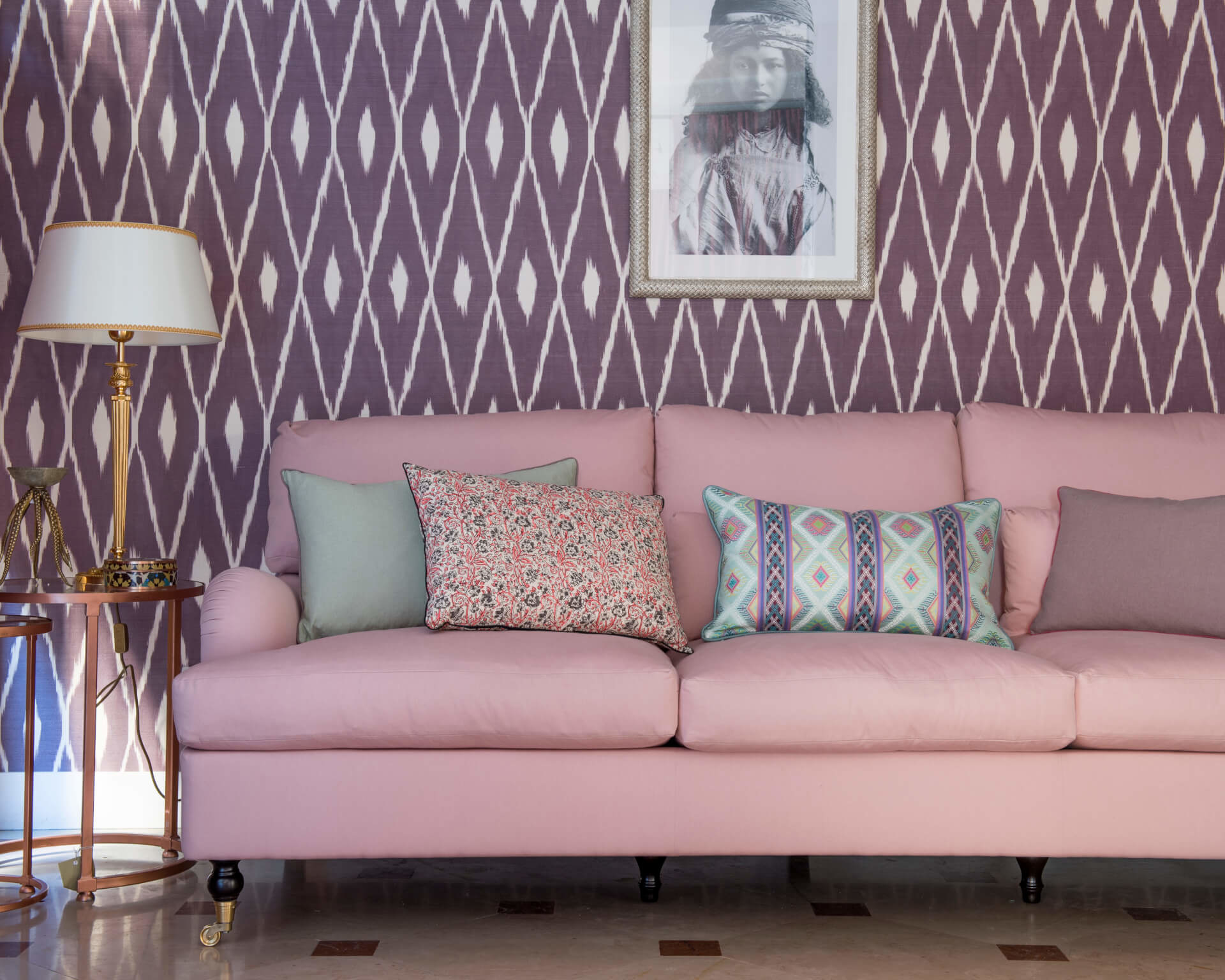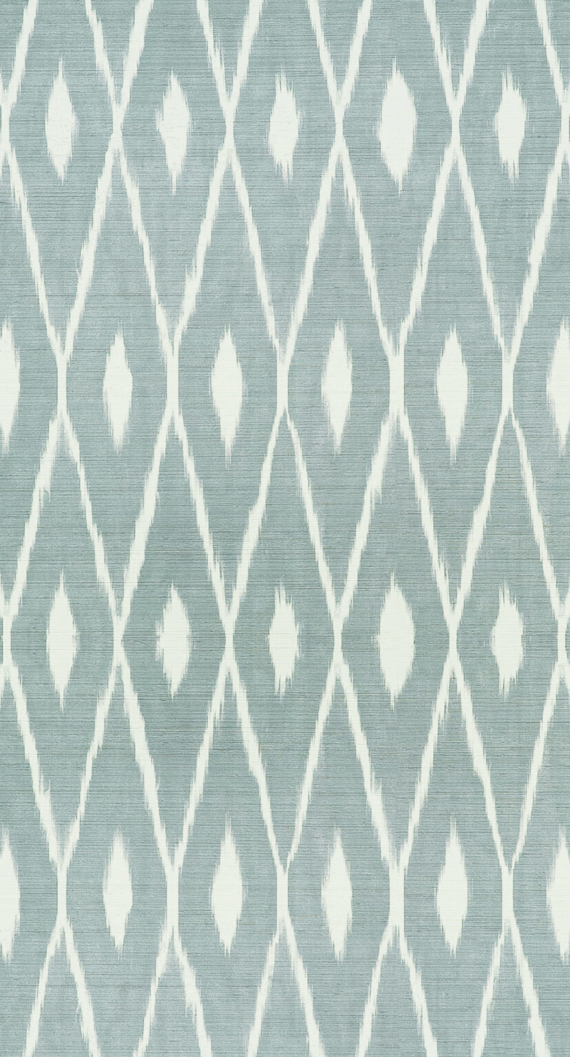 Op de manier van een ikat geeft dit tweekleurige geometrische patroon een subtiel vervagingseffect aan deze wandbekleding.