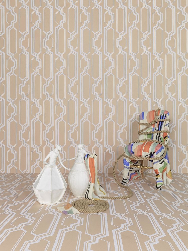 Ritmische en grafische streep die de architectuur van het Mariinsky-paleis oproept. De combinatie van traditionele bedrukking en de gezandstraalde inkttechniek brengt mat en reliëf in het ontwerp.