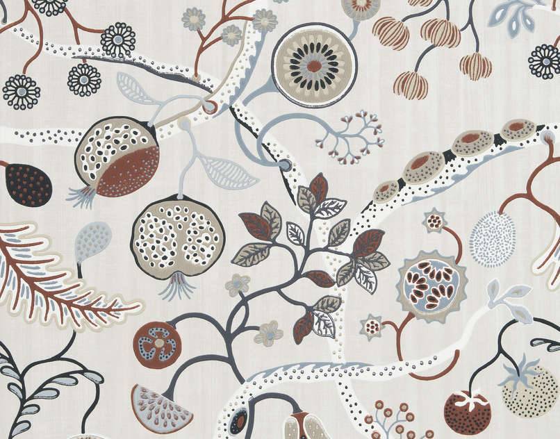 Bochtige vegetatie gevuld met bloemen en fruit. De overvloed en levendigheid van de ontwerpen creëren een kleurrijk, magisch universum. Hasta la vista! Getrimd.