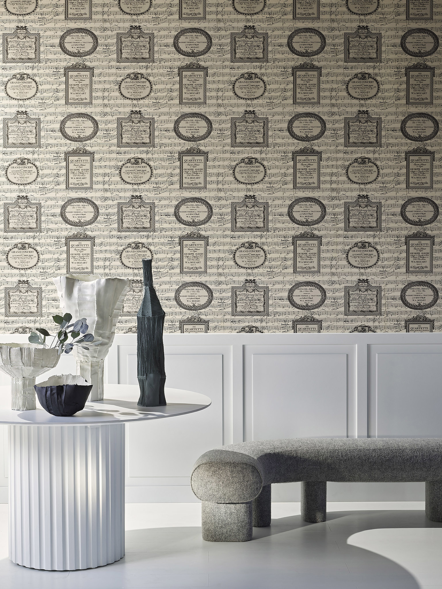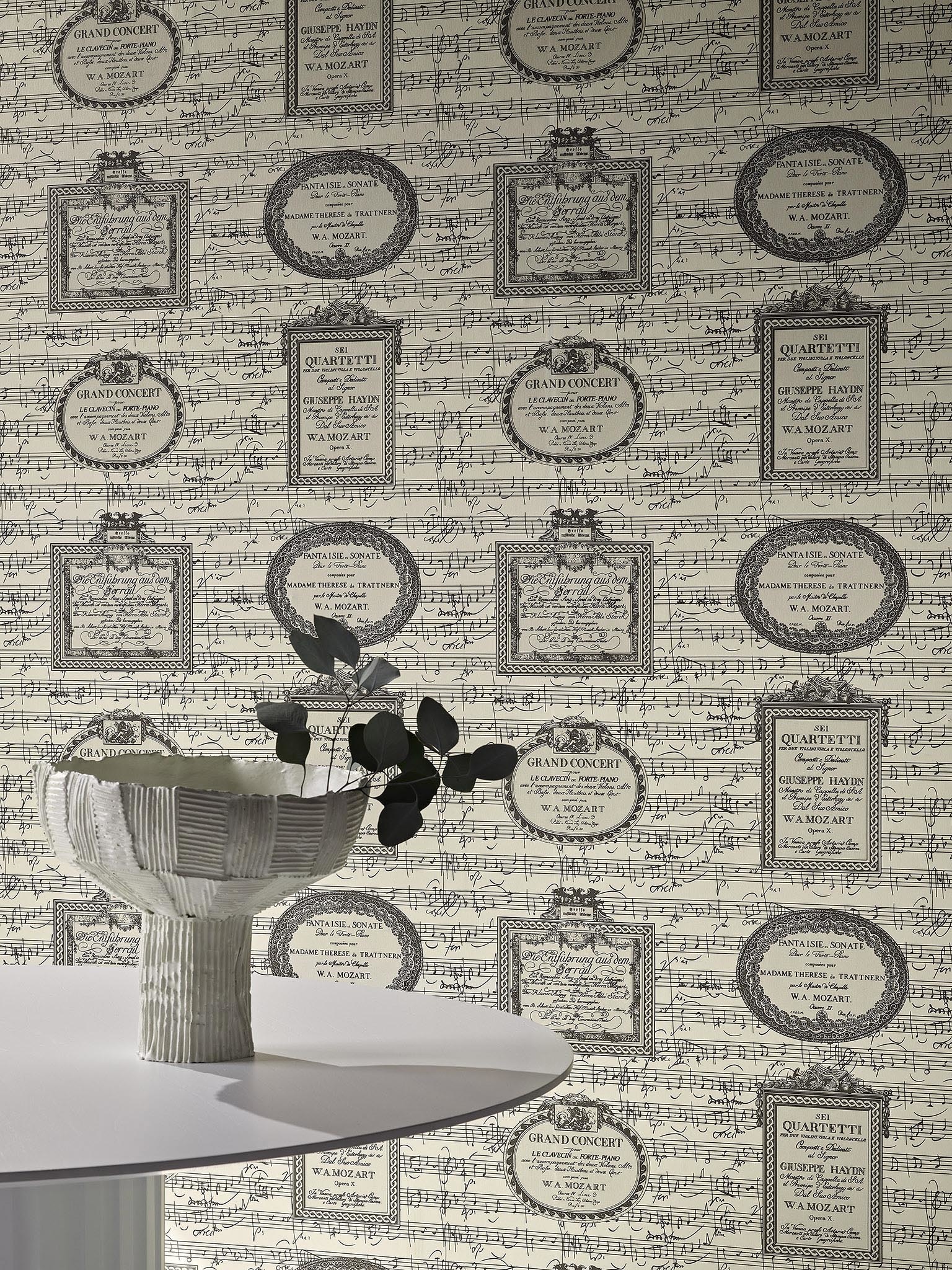 Pentagrama behangversie van een best verkochte stof van la Maison met een patroon samengesteld uit partituren als eerbetoon aan Mozart. Grootformaat bedrukking op een matte non-woven drager.