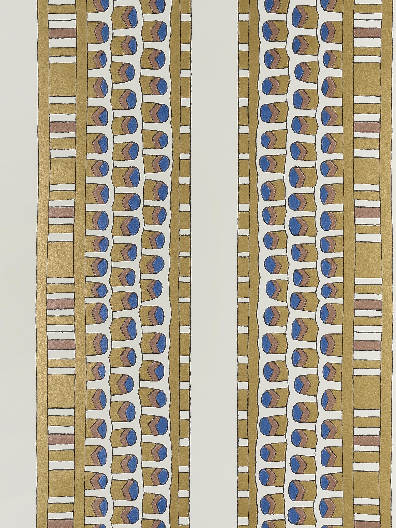 Deze streep, geïnspireerd op het deksel van een Egyptische kist in de afdeling Egyptische Oudheden van het Louvre, roept vrijelijk de fabelachtige opsmuk van de farao's op. De traditionele print met metallic reflecties benadrukt elegant de details van het behang.