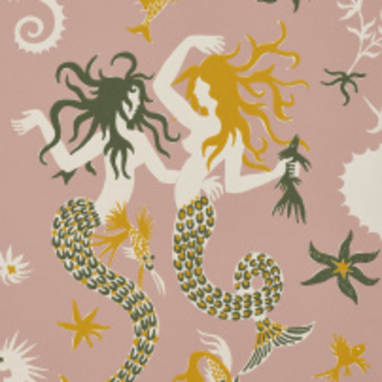 Dit ontwerp van zeemeerminnen illustreert de waterwereld en zijn godheden met een dromerige kwaliteit. POSEIDON, gedrukt in traditionele techniek met een handgeschilderd effect, is een reproductie van een gouache van de textielontwerper Irène Rohr uit 1945 en bewaard in de archieven van Maison Pierre Frey.