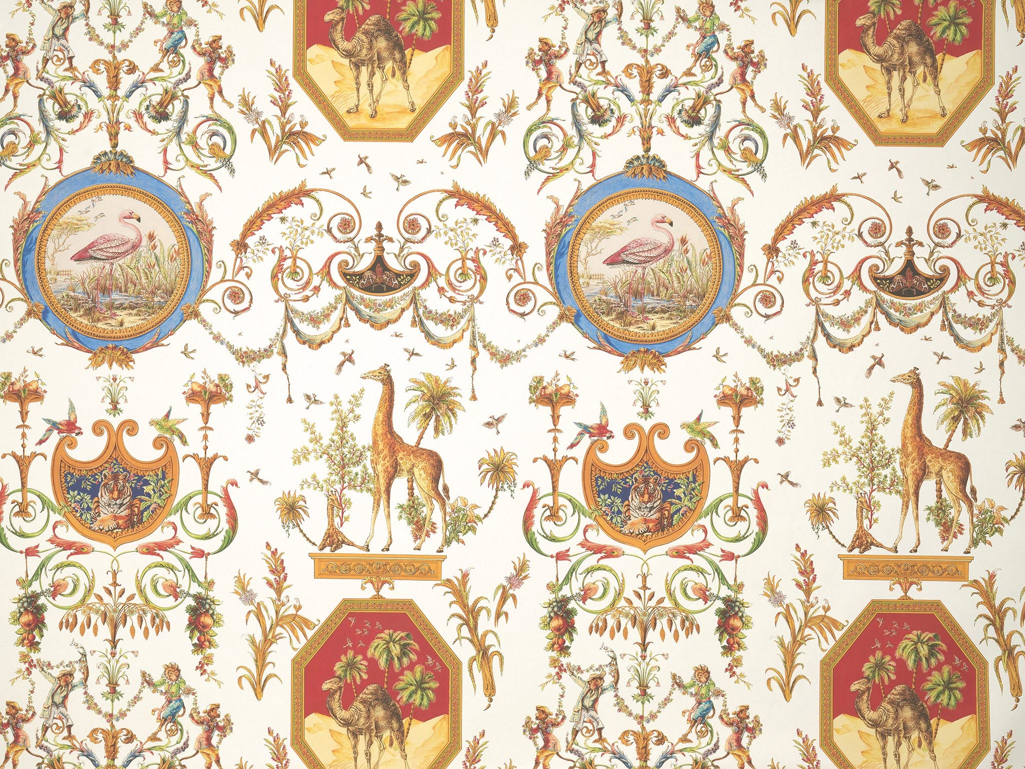 Retour d'Afrique is een behang dat geïnspireerd is op de 18e eeuwse singeries. Deze muurbekleding van Pierre Frey uit de Les Dessins 6 collectie toont een elegant patroon, vol giraffes, kamelen en flamingo's, geplaatst te midden van haast koninklijke vromen. Een exotisch behang dat perfect is voor een klassiek, sprekend en tijdloos interieur.