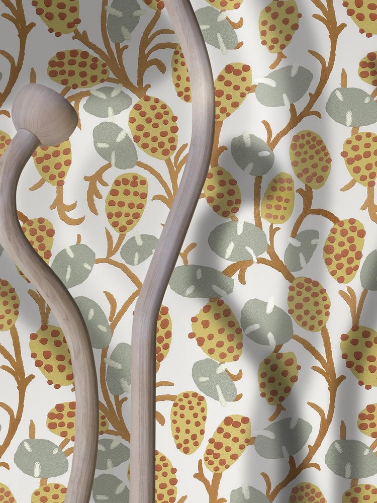Losjes gebaseerd op de plafondontwerpen van het graf van Sennefer, burgemeester van de stad Thebe (nu Luxor), is dit behang voorzien van royale wijnstokken bedekt met druiventrossen en grote bladeren. De traditionele rotatiezeefdruk geeft verfijning en verfijning aan deze charmante compositie.